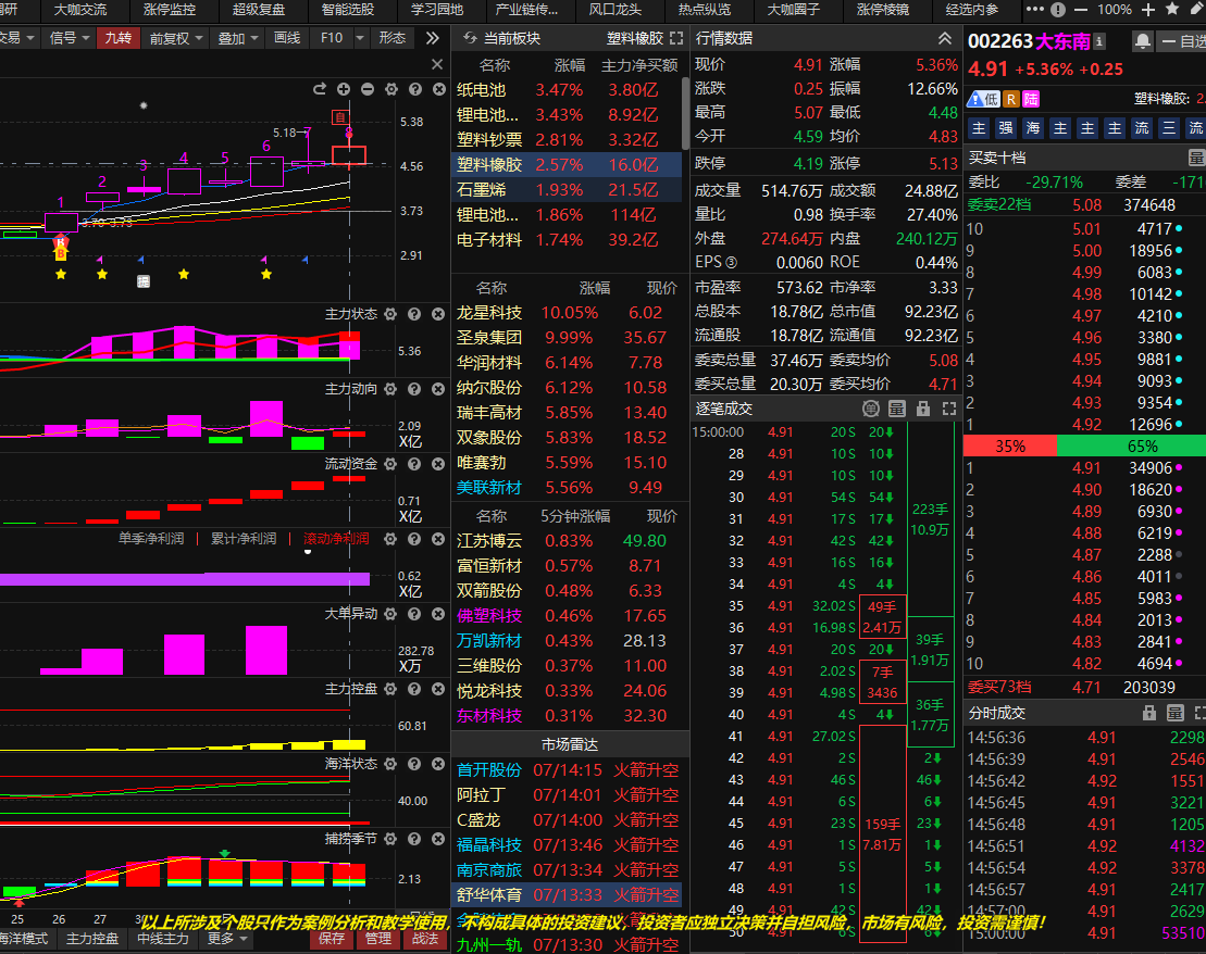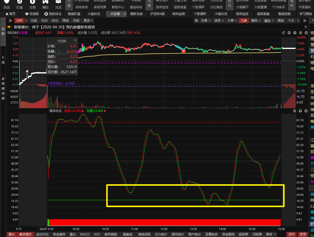 选出大东南(002263),锂电池概念龙二,符合双紫回档,主力动向紫柱频繁,代表真心做多的意愿强,需要结合分时海洋状态节奏来。 需要结合后续主力动向资金回流情况, 目前周线金叉月线金叉区域,等待日线金叉共振。!!! 后续如果主力动向天天翻绿,则视为不及预期,则放弃观察!!!!。需要把握好低吸节奏,谨慎追高,避免次日低开被洗。 以上所涉及个股只作为案例分析和教学使用,不构成具体的投资建议,投资者应独立决策并自担风险,市场有风险,投资需谨慎!