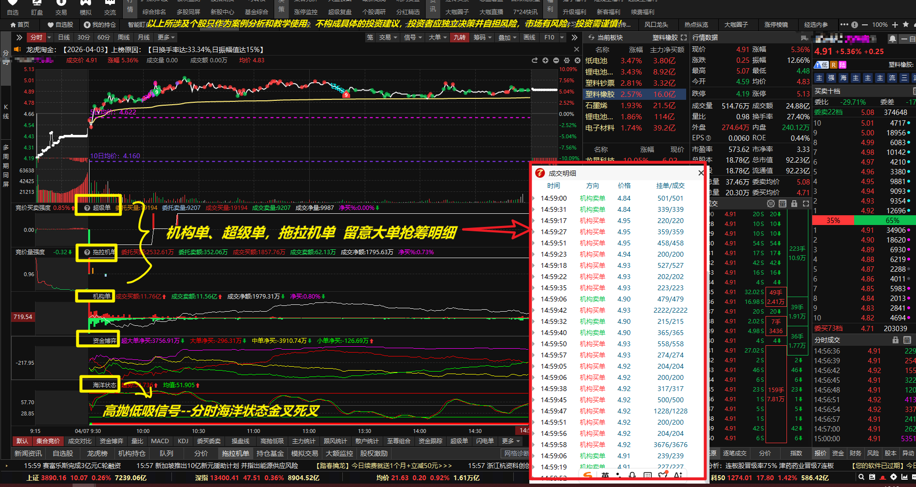 分时技巧:可以把机构单,拖拉机单,超级单,资金博弈,海洋状态在分时逐个加入进去,方便看盘。 看大单抢筹明细, 海洋状态看低吸高抛为主。金叉低吸,死叉高抛,方便做T和寻找低吸点。下图是分时技巧,对照看。