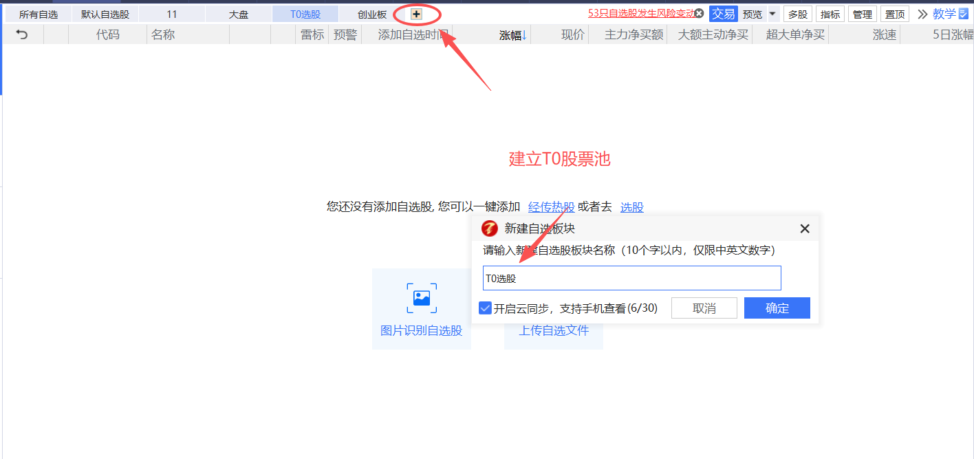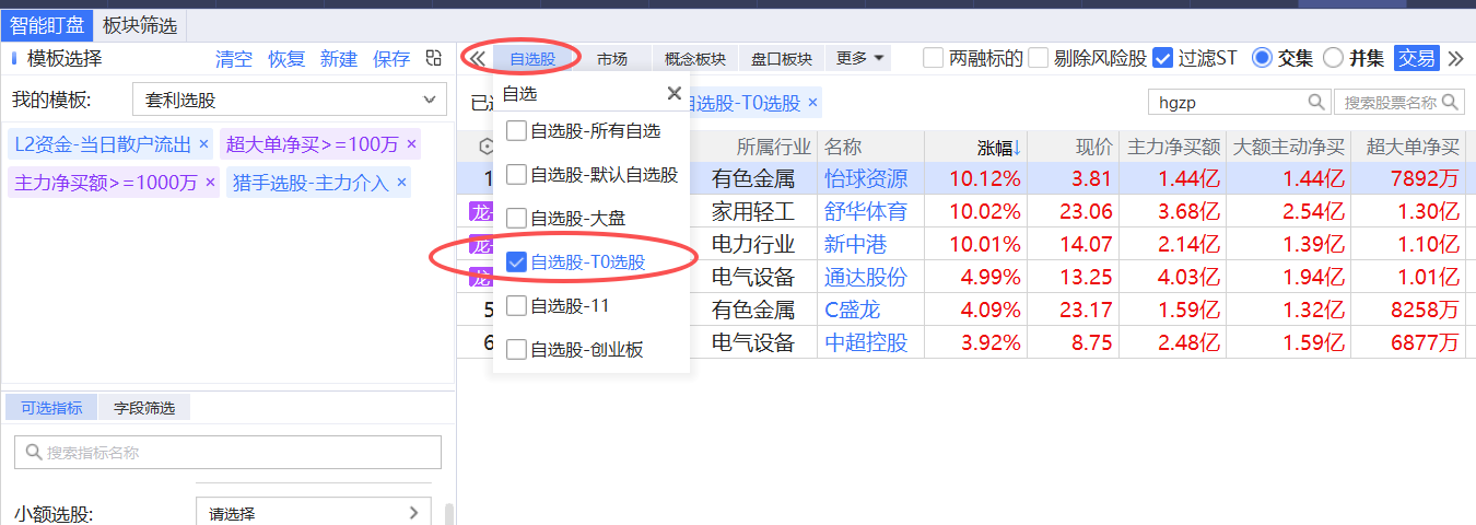 四、加入自选T0股池之后,就可以进行智能盯盘一键选股,点击"自选股"、然后勾选刚刚建立的"T0股池"就可以进行快速筛选