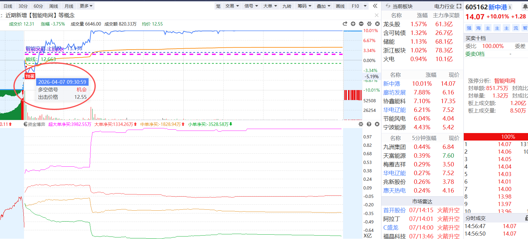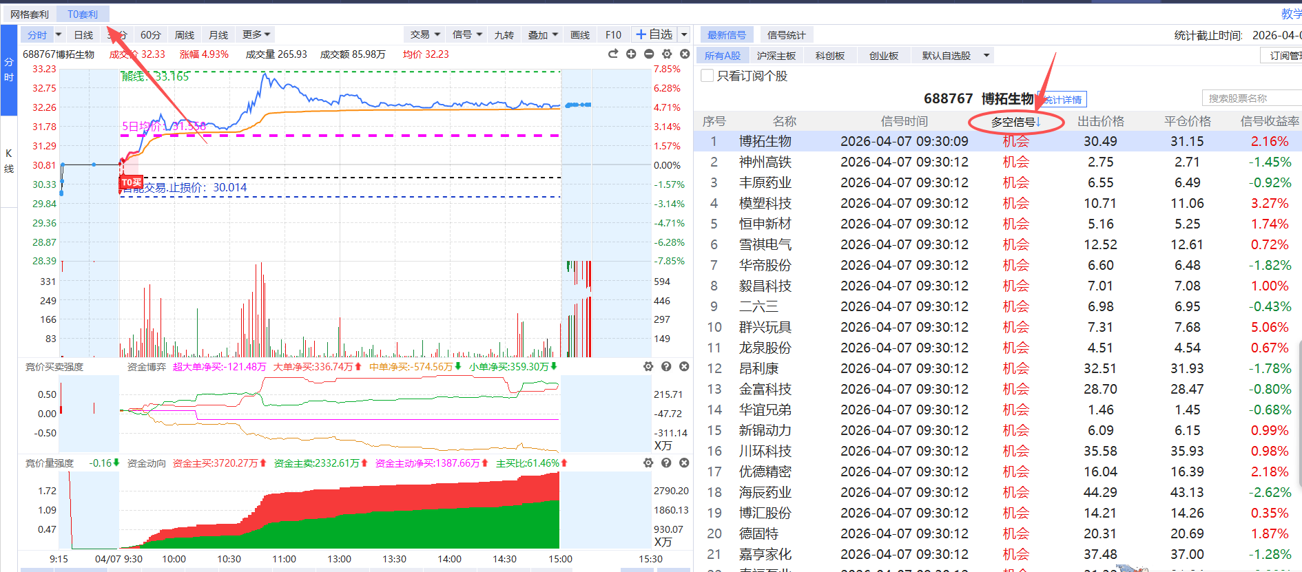 选择左上角的”T0套利“,然后进行”多空信号“的排序,如上图所示