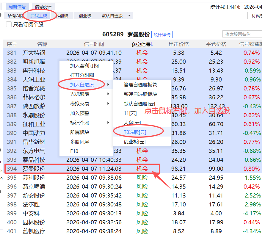 点击第一只股票,然后按住键盘左下角的“SHIFT”键不要放开,一直往下滑,直到出现红色“机会”结束,然后放开“SHIFT”一键选中,紧接着点击鼠标右键,选择加入自选股,最后放到前面设置的T0选股的股票池里。