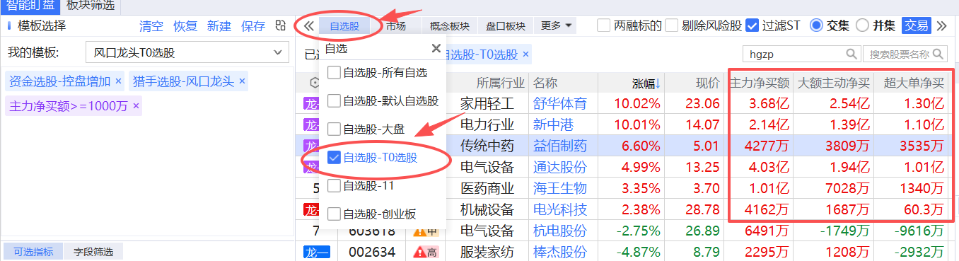 注:两套方法都可以用来筛选,优选沪深主板的建立股票池,胜率高些,选股时间:9点35分-10点可以进行多次筛选,资金要求:主力净买额,大额主动净买,超大单净买全部资金共振,才可以考虑操作!!!