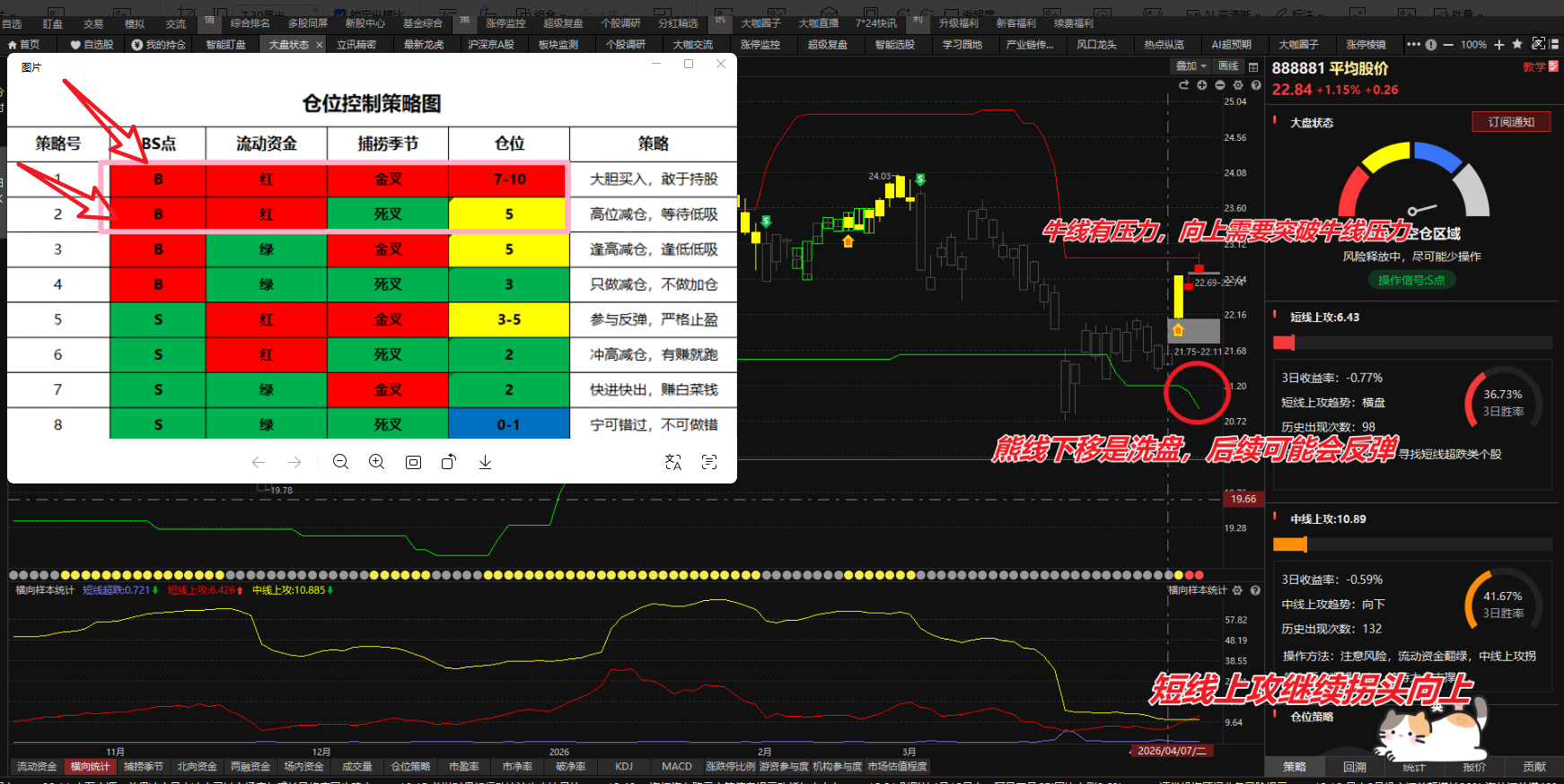 大盘分析:目前大盘出现B点信号,等待B点回档金叉;现在熊线下移是洗盘,后续熊线走平可能会反弹。横向样本统计短线上攻开始拐头向上,流动资金3天翻红。按照仓位管理图,B点区域+流动资金翻红+捕捞季节金叉,是7-10成左右,根据自身情况5-7成左右,不建议满仓,还没到满仓的时候,留点底仓灵活应对。现在平均股价有牛线压力,周末美伊谈判没谈好,美国要伊朗 “自废武功”,伊朗要美国 “放弃霸权”—— 根本不是一个频道。 懂王又说不看谈判结果,都是我赢, 看清TACO交易、唐子兵法和三大新学说。