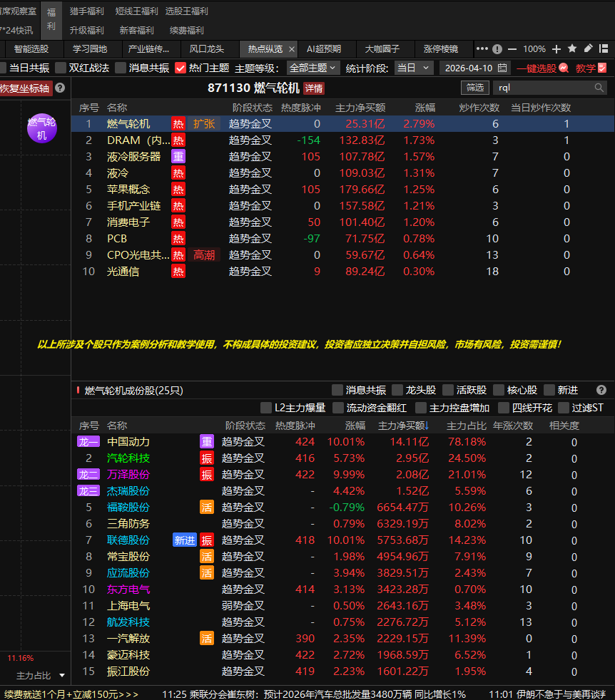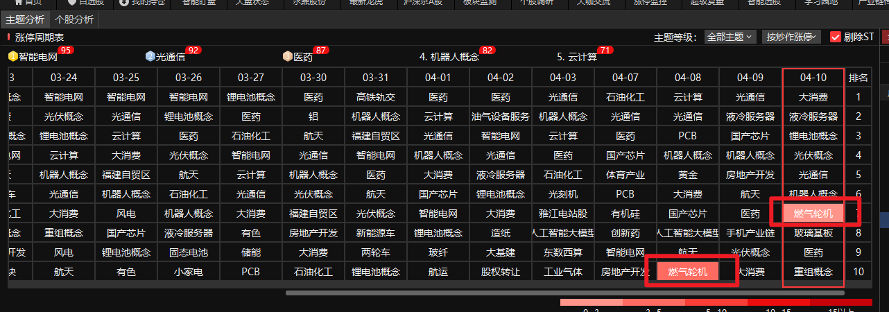 燃气轮机:从涨停棱镜最新异动看,燃气轮机上榜两天,虽然没有排名第一第二,但是可以发现是最近异动的新方向。从热点纵览也发现燃气轮机是热门主题,且主题在扩张。 消息面:北美算力市场保持高增趋势,电力需求拉动燃气轮机景气度,头部厂商如西门子、GV等排产周期大幅延长。全球燃气轮机市场呈现寡头垄断格局,前三大厂商占据80%份额:三菱重工(日)、西门子能源(德)、GE Vernova(美)。当前外资巨头订单增长、产能饱满,国内配套及整机厂核心受益。涨停棱镜是上看,异动的个股中国动力、万泽股份、联德股份等已经涨停。