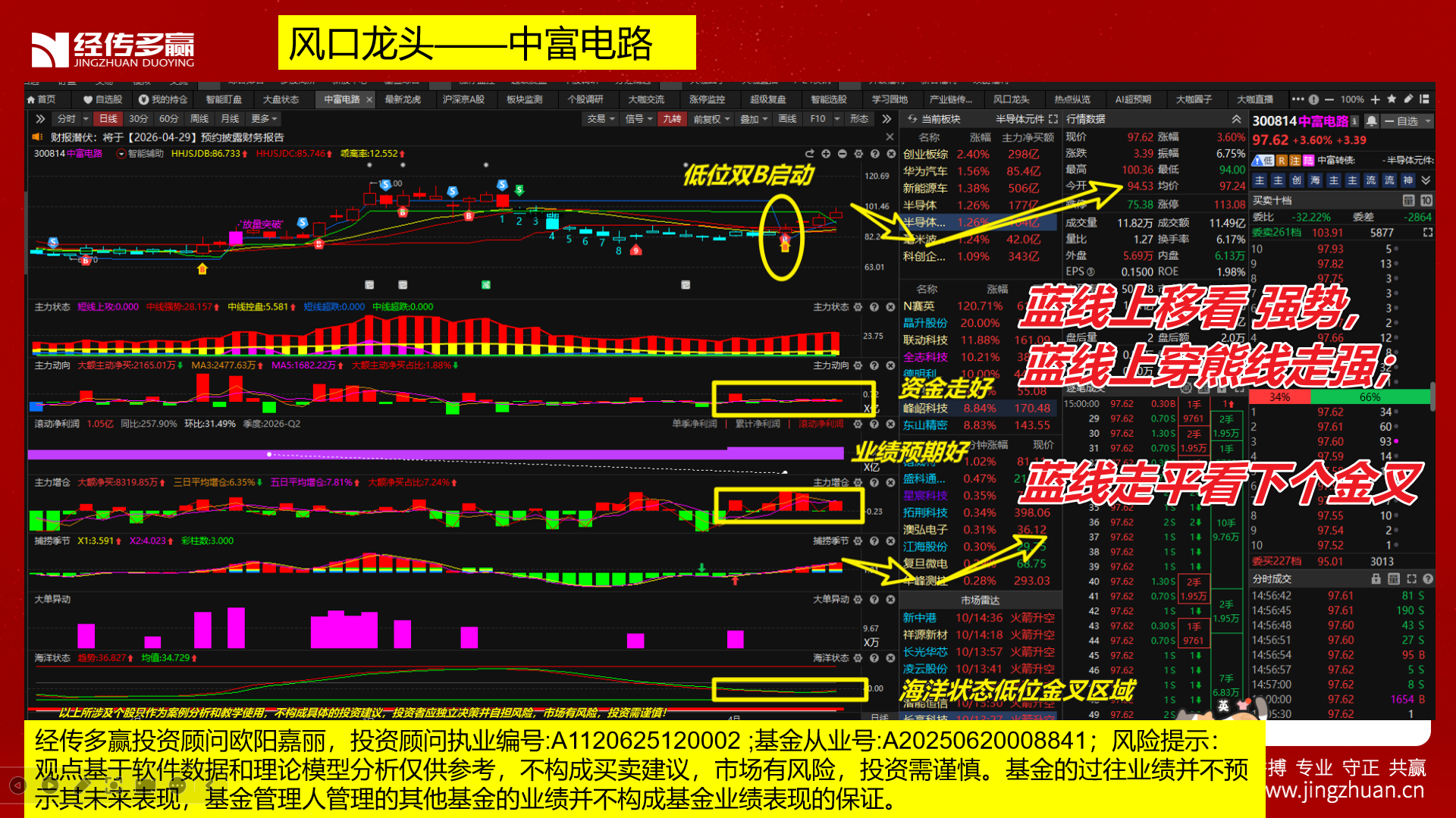 选出中富电路300814,底部双B启动,海洋状态低位金叉,周线回档金叉,主力动向最近资金红,高控盘二次增加,如果蓝线上移继续看强, 蓝线上穿熊线走强;如果蓝线走平看下个金叉。后续跌破辅助线,主力动向走坏则放弃观察。——以上所涉及个股只作为案例分析和教学使用,不构成具体的投资建议,投资者应独立决策并自担风险,市场有风险,投资需谨慎!