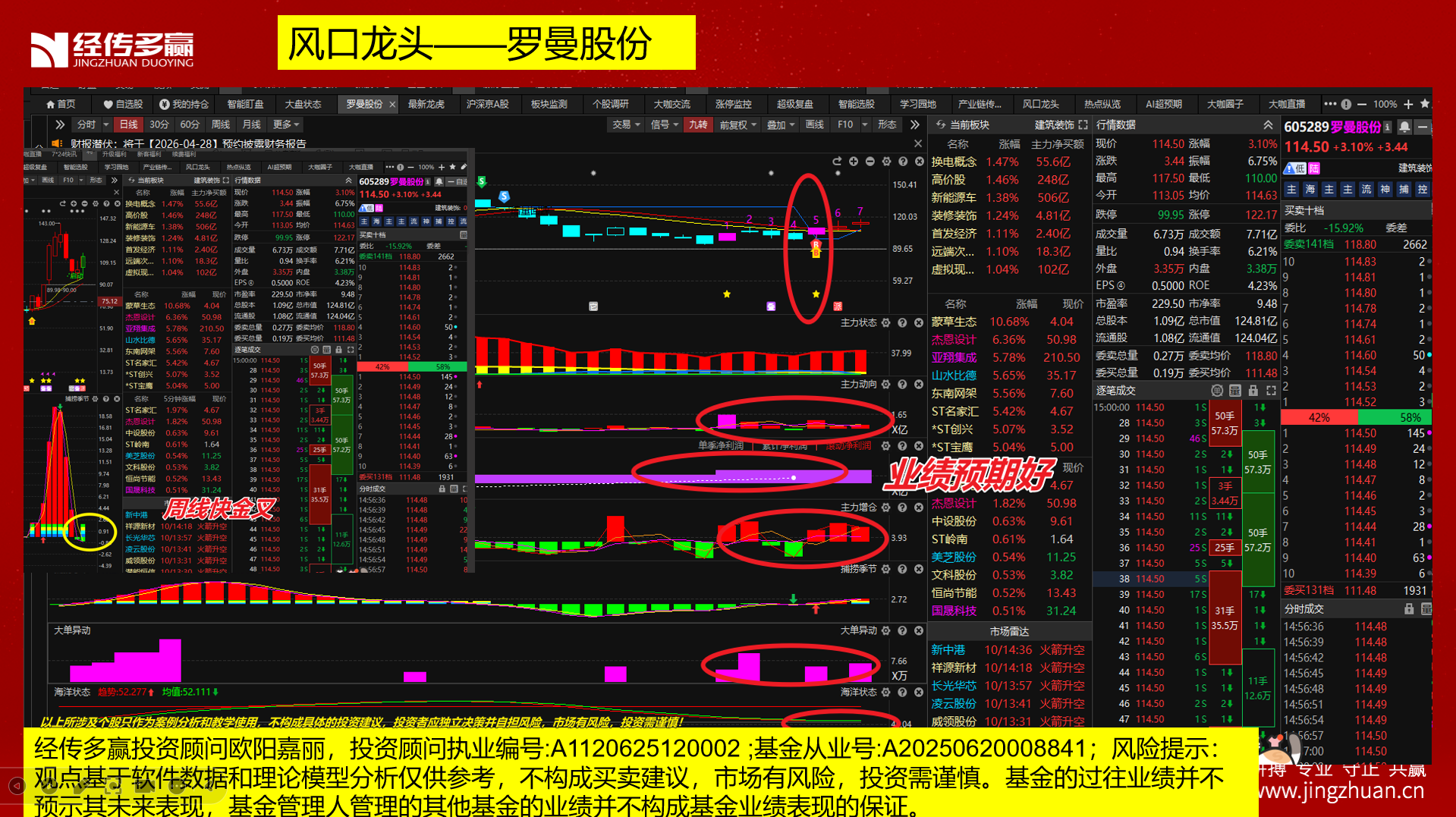 选出罗曼股份,目前是龙一,高价股,双B启动,大单流入,业绩预期好,周线快金叉,等待游资进场。 后续跌破辅助线,主力动向走坏则放弃观察。——以上所涉及个股只作为案例分析和教学使用,不构成具体的投资建议,投资者应独立决策并自担风险,市场有风险,投资需谨慎!