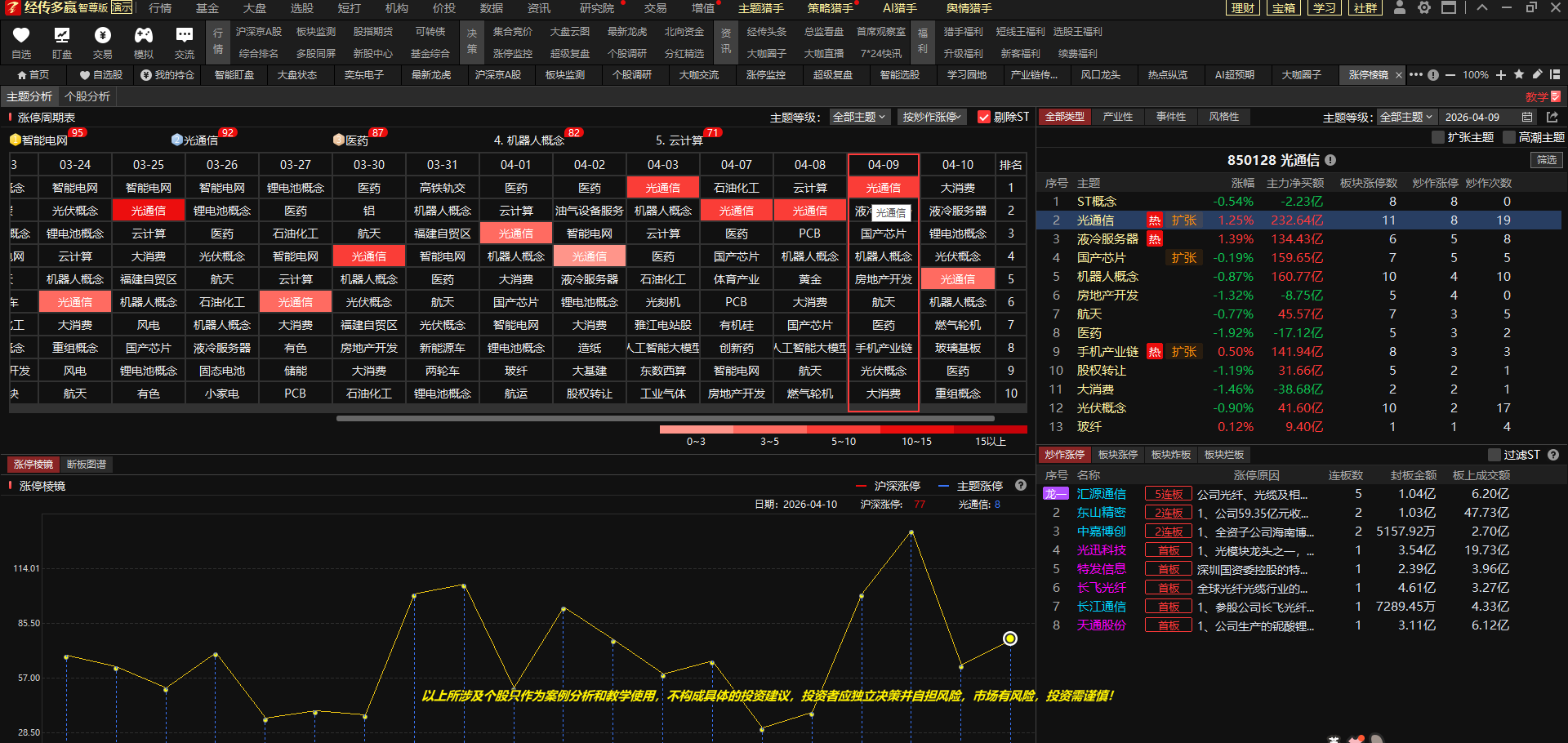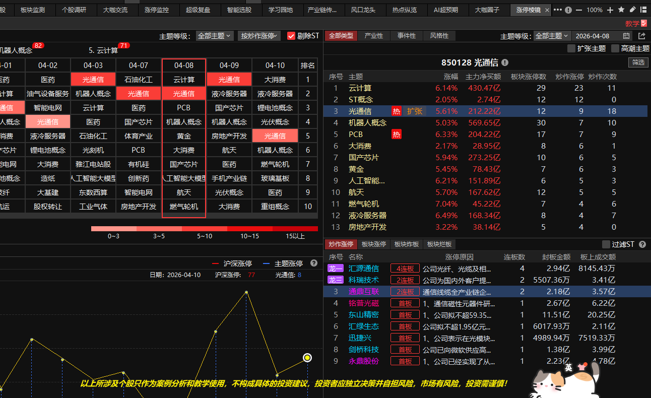 涨停棱镜显示,最近频繁上榜的主题方向是AI 算力 / CPO / 光通信(最强),锂电池,液冷服务器,医药、燃气轮机(刚刚开始2次异动方向)等。AI 硬件需求爆发,光模块 / 光纤 / PCB 是算力网络核心,机构 + 游资合力最强。大资金机构风格抱团 趋势龙头,波段为主,分歧小。