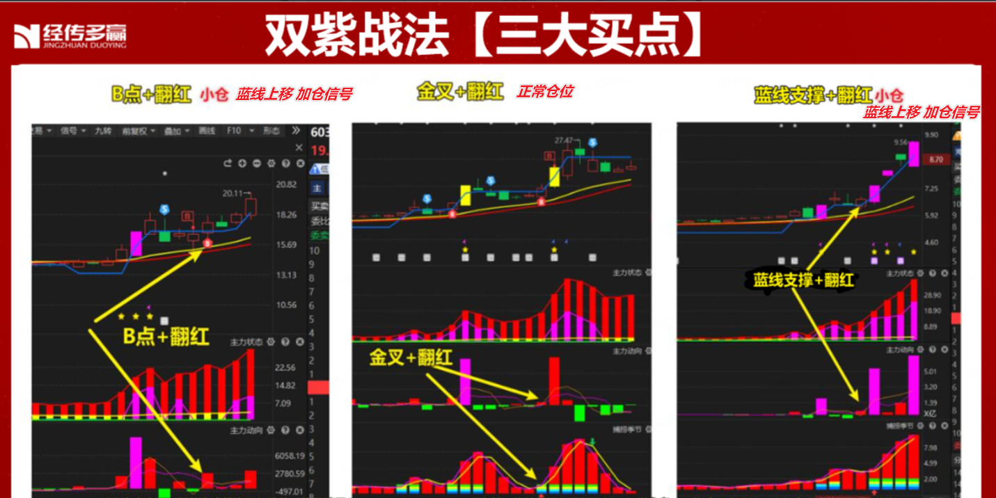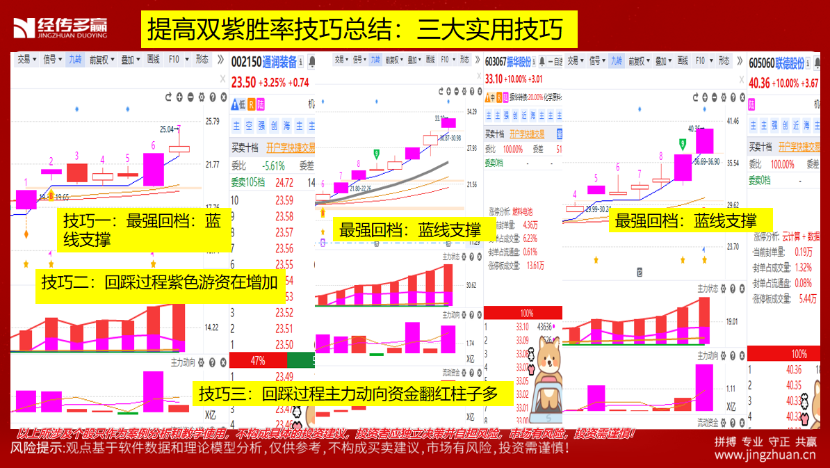 选股不代表买股信号,参考双紫买点信号,后期趋势、周线、控盘、主力动向走坏、跌破辅助线 则需要剔除!以上所涉及个股只作为案例分析和教学使用,不构成具体的投资建议,投资者应独立决策并自担风险,市场有风险,投资需谨慎!