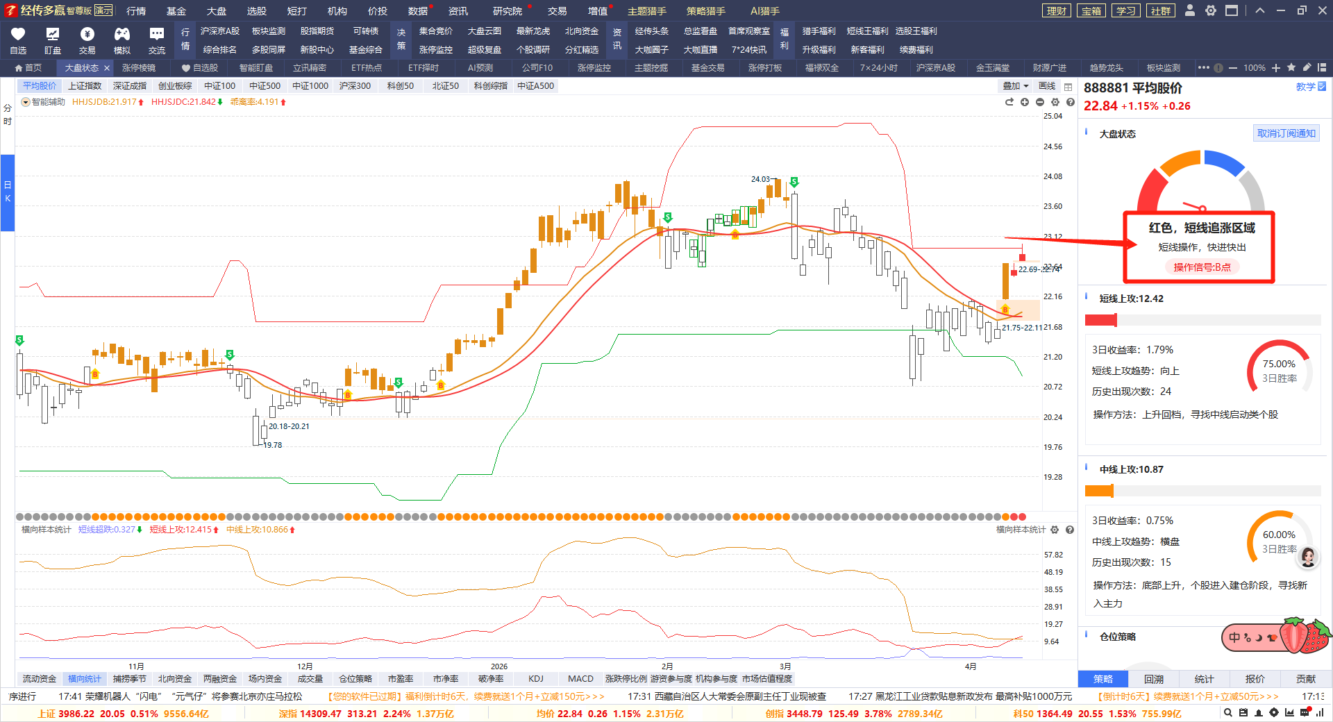 B点+流动资金3天翻红+周线金叉,确认趋势反转行情,注意这一轮的B点行情是短线追涨红色区域,所以选股上适合找强者恒强的股票参与。仓位可以去到5成仓把握~