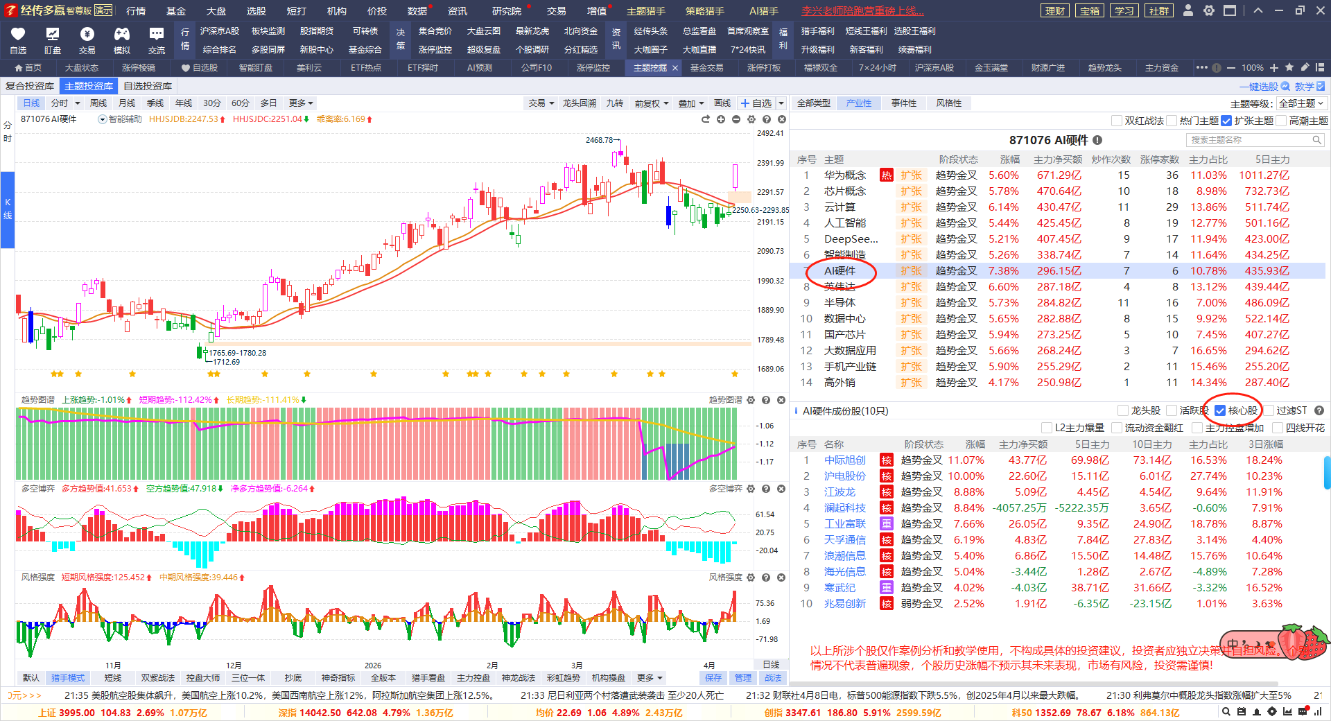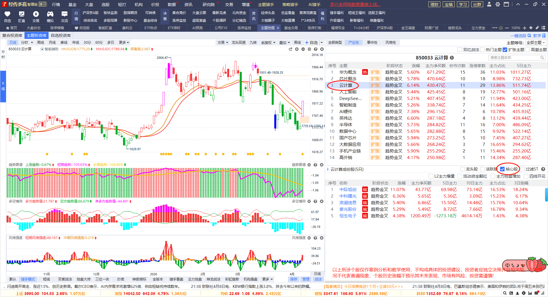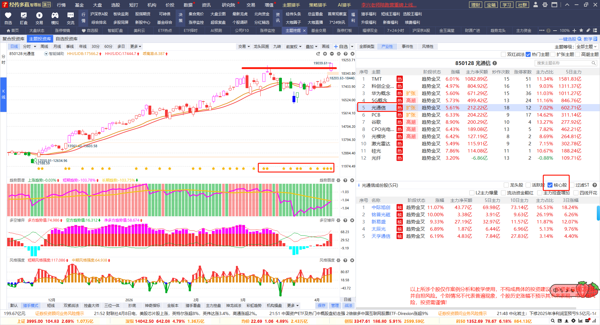 龙头回档是短线思路,核心股是做波段,它们的风格是不一样的,先做好交易计划,自己需要做短线还是中线波段,再选对应功能符合的股票即可。个别朋友,喜欢短中线股都操作,则分好短中线的仓位比例。但注意一个问题,同方向的个股布局,不建议买太多,控制好2-3只的数量。