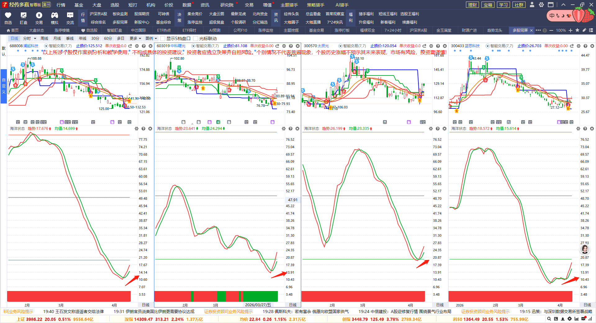 其中,【澜起科技】【中科曙光】【太辰光】【中芯国际】【蓝思科技】等等符合海洋状态底部金叉启动,同时也是近期刚出B点,留意回踩支撑买点机会。