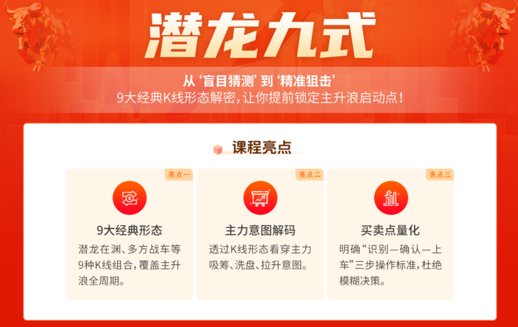 何老师翻遍了近10年强势股的走势,发现它们在主升浪启动前,竟然惊人地相似。花了无数个夜晚,终于总结出9大经典形态,帮助你在实战中精准识别主力意图,稳稳把握主升浪起点。这套方法,已经被系统整理为课程——《潜龙九式》。