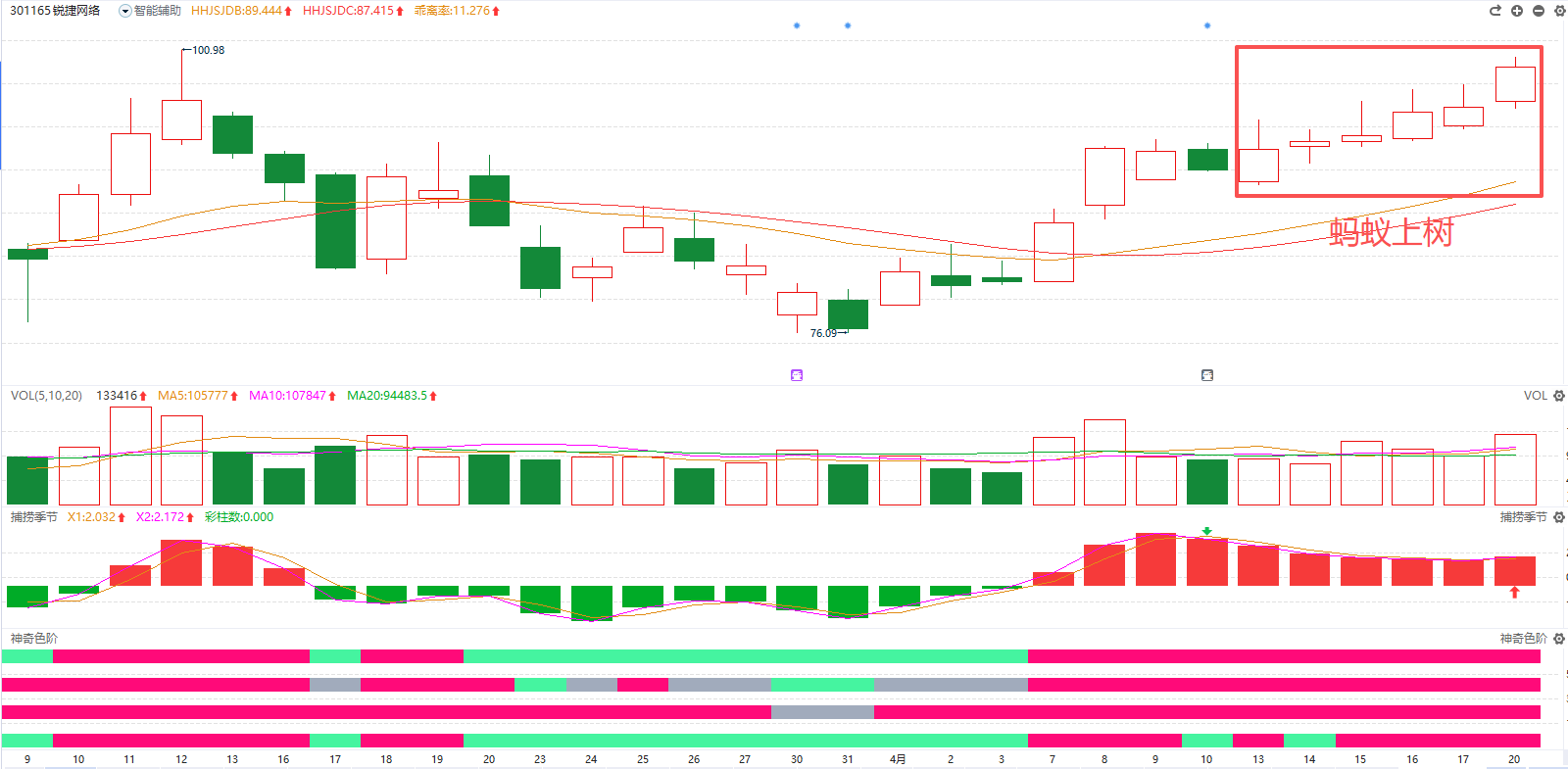 比如最近的锐捷网络,已经初步走出“蚂蚁上树”的雏形。前期充分盘整,主力资金悄悄布局。在《潜龙九式》课程中,何老师不仅详细拆解了每一个经典形态的识别方法,还量化出来如何把握买卖点,真正做到学完就能用。(以上所涉个股仅作案例分析和教学使用,不构成具体的投资建议,投资者应独立决策并自担风险。个别情况不代表普遍现象,个股历史涨幅不预示其未来表现,市场有风险,投资需谨慎!)