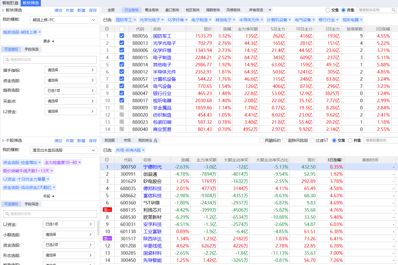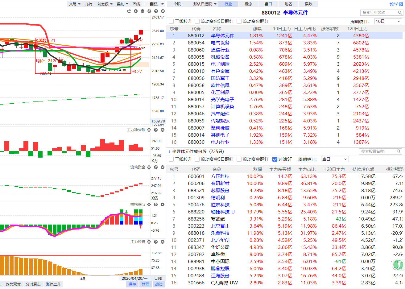 半导体,电气,通信,机械,电子,有色,化工,国防,软件,化工,光学,等十日资金靠前,且都超200亿。聚焦强势板块的强势个股,顺势而为。