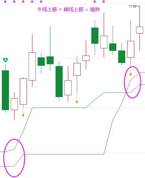 强势形态:能线在上,带动箱体向上突破,后续转为牛能线同步向上。