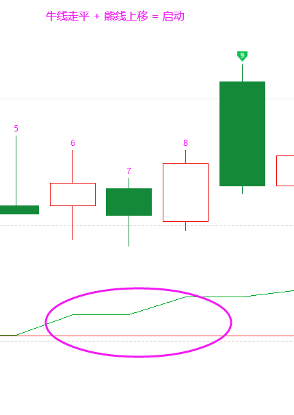 2、启动形态:牛线走平 + 能线上移 --- 结合流动资金看捕捞季节的节奏捕捉机会