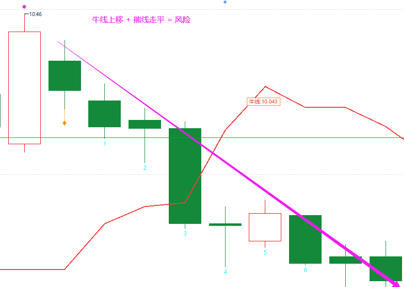 6、风险形态:牛线上移 + 能线走平 --- 谨慎操作,注意捕捞金叉死叉 和 S点区域(智能交易S点和慧眼k线S点)!需要按照软件信号减仓或者直接清仓操作!