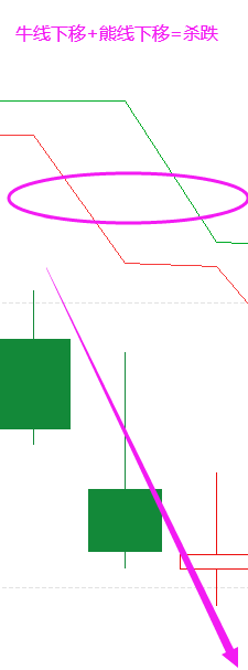 7、杀跌形态:牛线下移 + 熊线下移 ---杀跌形态开始了!以能线作为标准, K线可能会至少 跌至 能线下方7% 以上,进入空头陷阱,不过急跌将有急反弹,注意后续有望的短线反弹节奏。